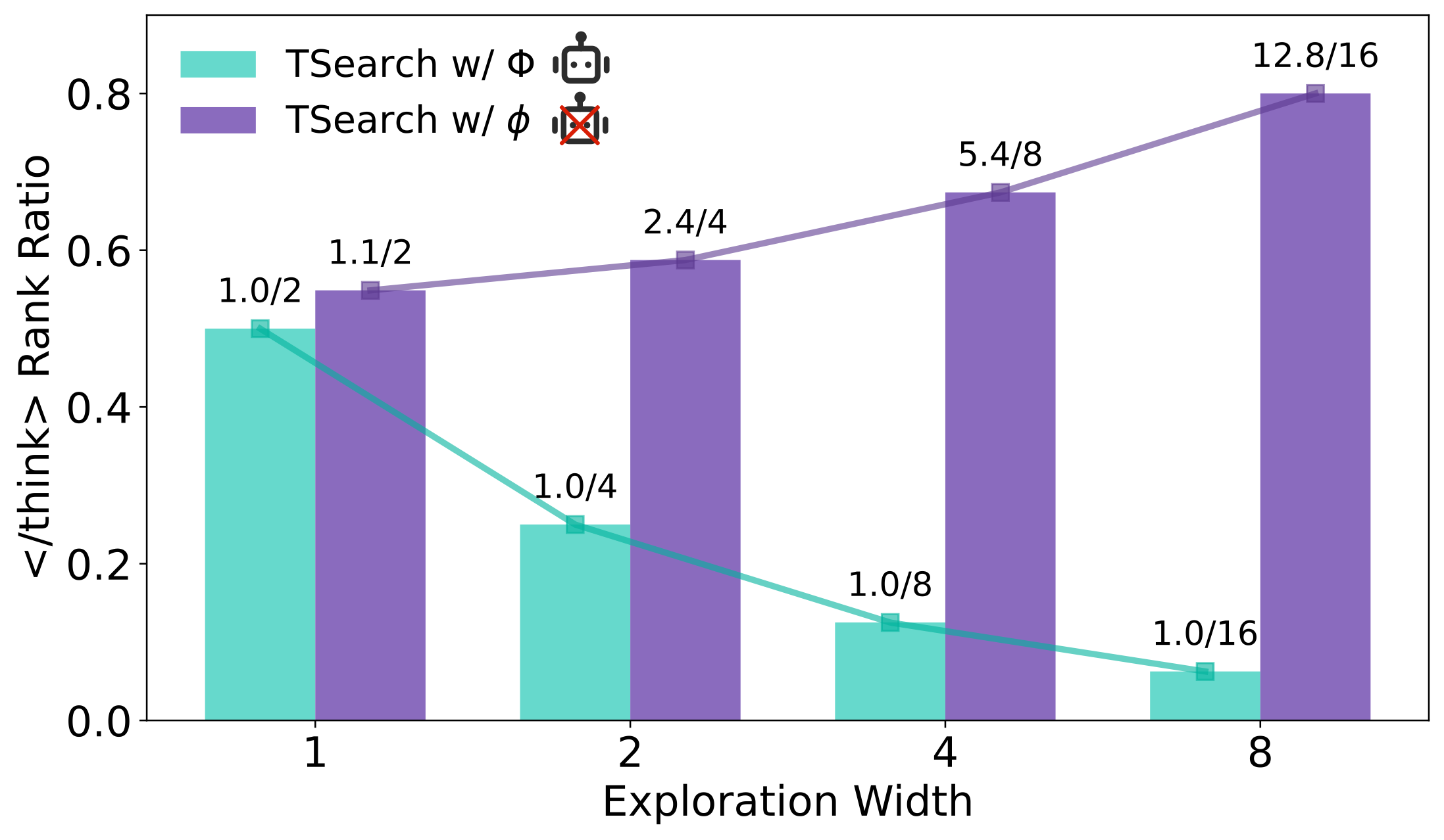 Once the exploration width exceeds 2, the growth rate of inference time accelerates further. Therefore, we primarily set exploration width $m$ = 2, which represents the transition point between the slow-growth and fast-growth regions, to achieve a balanced trade-off between efficiency and performance.