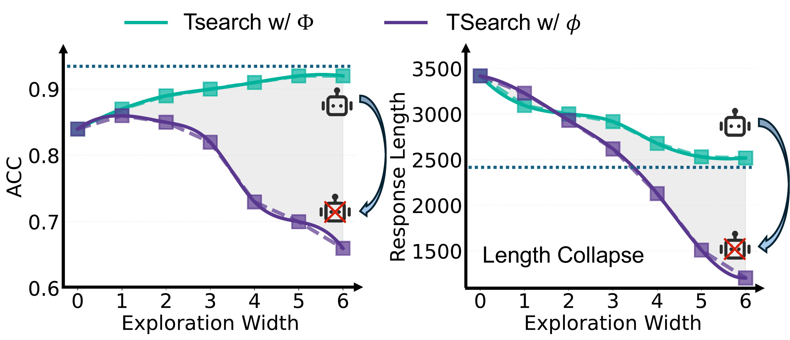 Using a cumulative log-probability score $\Phi$ to track high-confidence reasoning paths, we find that increasing exploration width leads to consistent response length reduction AND accuracy improvement. In contrast, paths selected by next-token probability ($\phi$) suffer rapid accuracy degradation (length collapse).